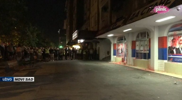 Како је приказано на ТВ Пинку блокадери у Новом Саду који су се скупили испред просторија СНС шарају просторије и уништавају их.