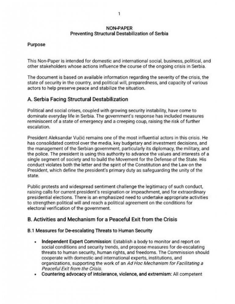 -Због озбиљних безбедносних изазова, посебан фокус је на улози председника, Савета за националну безбедност и безбедносно-обавештајних служби. Не питање "ко ће заменити Вучића", већ како омогућити демократску смену и миран пренос власти, пише у нон пејперу који је Душан Јањић послао 13. августа, а који је како је навео - намењен домаћим и међународним друштвеним, пословним, политичким и другим актерима чије активности утичу на ток актуелне кризе у Србији.