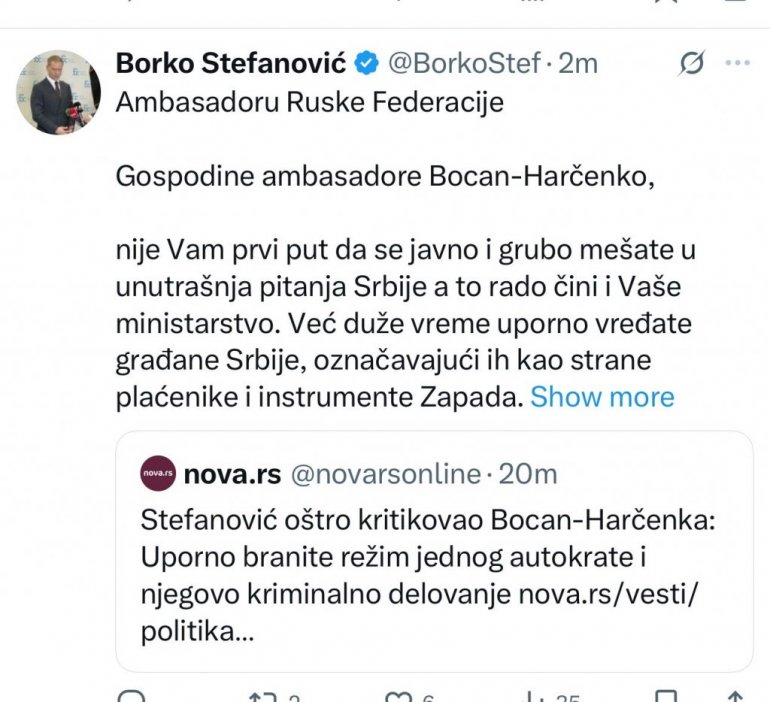 - Оно што ипак можете очекивати јесте Србију слободну од криминала и корупције и Србију која зна да је њена будућност у Европи, без обзира на сва противљења Вашег пријатеља Александра, његове хунте, али и Ваше Владе. - срамно поручује Стефановић.
