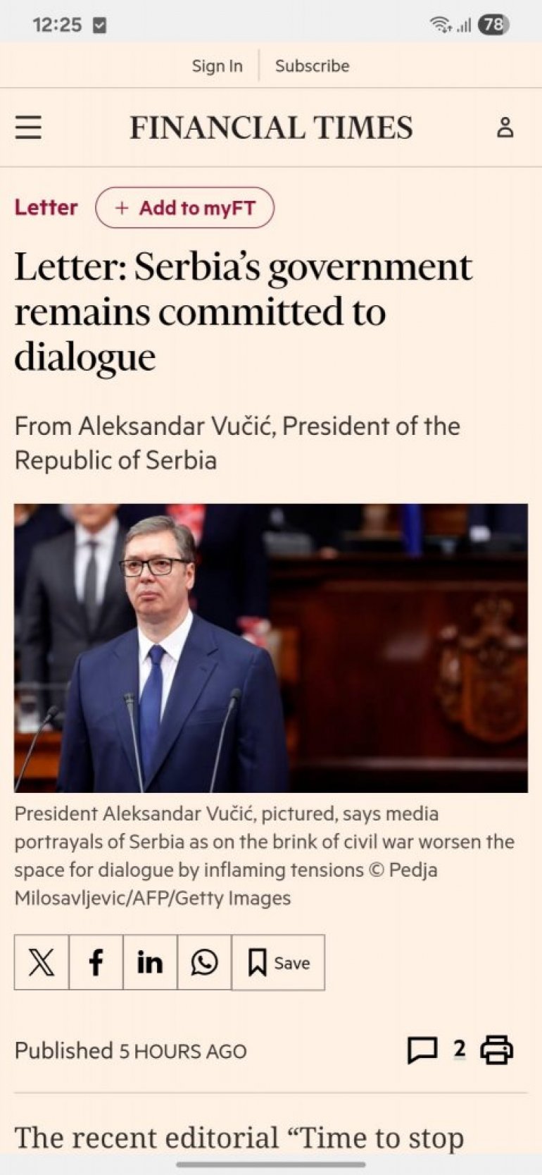 "ВЛАДА СРБИЈЕ ОСТАЈЕ ПОСВЕЋЕНА ДИЈАЛОГУ": Financial times објавио писмо председника Вучића (ФОТО)