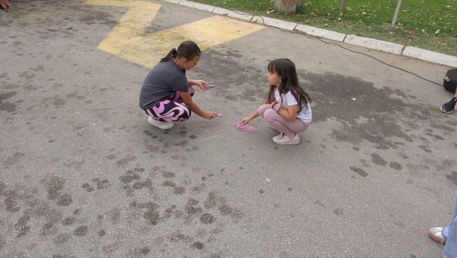 Наиме, малишани на кружном прелазу кредом цртају и остављају поруке грађанима против блокада који ће се окупити у овом месту.