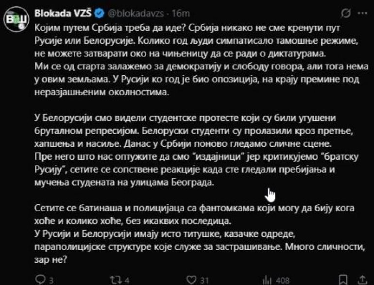Тако су блокадери Више здравствене школе поручили да је руски председник Владимир Путин диктатор. На удару блокадера нашао се и председник Белорусије Александар Лукашенко.
