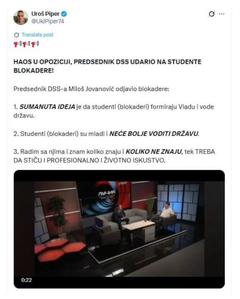 Пипер је објавио на мрежи X снимак у коме председник ДСС-а Милош Јовановић говори о идејама студената блокадера, истичући да је Јовановић "одјавио блокадере".