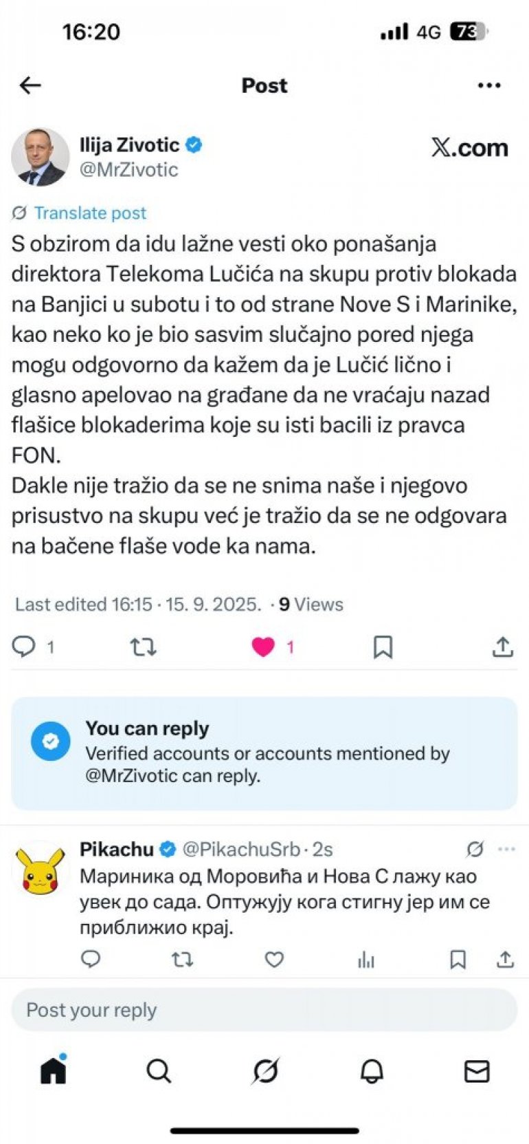 С обзиром да иду лажне вести око понашања директора Телекома Лучића на скупу против блокада на Бањици у суботу, и то од стране Нове С и Маринике, као неко ко је био сасвим случајно поред њега могу одговорно да кажем да је Лучић лично и гласно апеловао на грађане да не враћају назад флашице блокадерима које су исти бацили из правца ФОН. Дакле, није тражио да се не снима наше и његово присуство на скупу, већ је тражио да се не одговара на бачене флаше воде ка нама - објаснио је Животић на мрежи X.