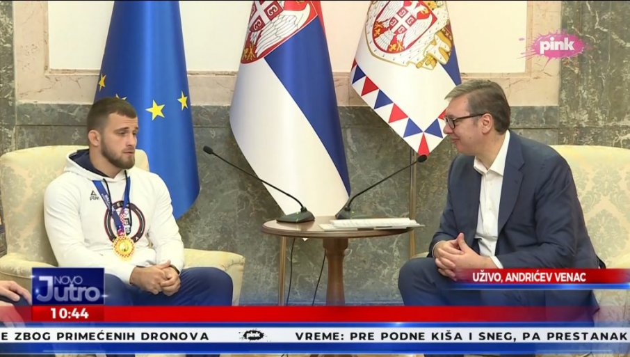 - Хвала вам пуно за пријем. Пун сам емоција. Жао ми је што мој тренер Војислав Трајковић није данас овде пошто је пуно учинио за мене. Желим да тренирам и донесем медаљу у Лос Анђелесу 2028. године. Србија ми је све дала. Нашао сам овде жену. Постао сам и отац ове године, добио сам сина Павела. Направио сам највећи резултат у каријери. Најпре европски, па светски успех. Захвалан сам Србији на свему што ми је пружила. Захвалан сам тренеру, Савезу и Вама председниче на подршци.