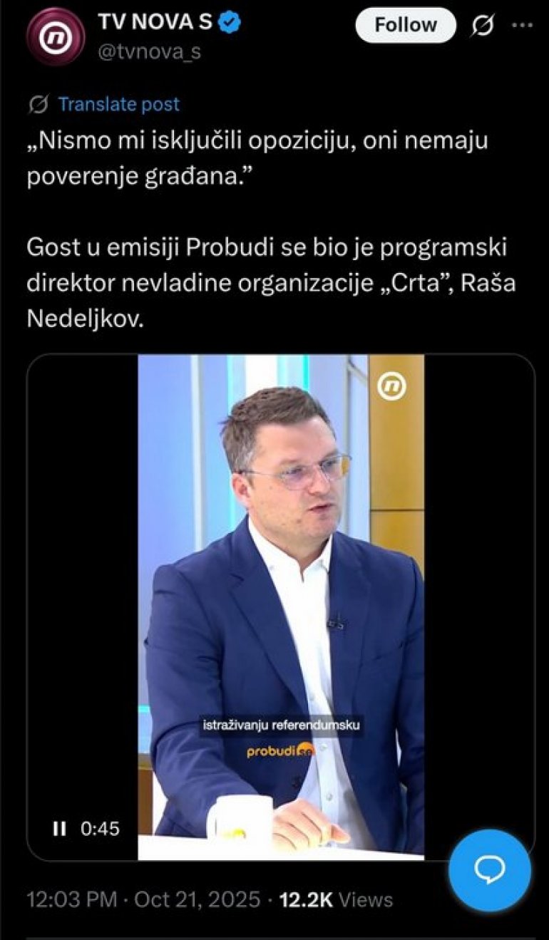 Гост јутарњег програма на Нова С "Пробуди се" био је програмски директор ЦРТА-е Раша недељков који је приказао најновија исттраживања. Укратко можда се опозиција и пробуди када схвати да је народ неће. Можда.