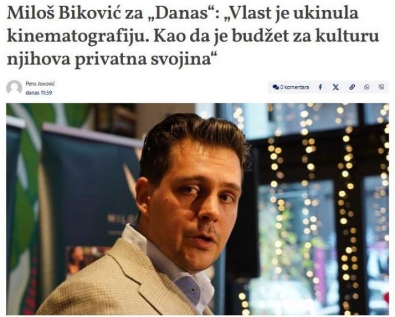 - Постоје црне листе. Изнијансиране су. Гипке. Некоме је забрањено да продуцира, некоме да глуми, некоме све. Можете да се скинете са листе или да се на њој опет нађете ако превише упражњавате право да говорите оно у шта верујете. Листе су се толико прошириле да је власт решила да не распише ни један конкурс за филм у 2025. години. Нама је власт де фацто укинула кинематографију ове године. По принципу: 'Ми их финансирамо, а они нас критикују - е па не може!' Као да је буџет за културу њихова приватна својина - закључио је Биковић, очигледно бесан што не може више на најаве пројекта, који се никад нису десили, да вара државу!