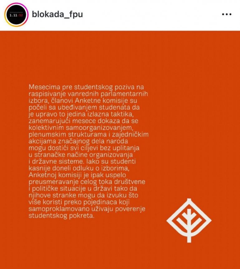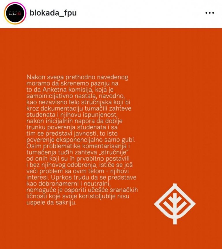 - Анкетна комисија, која је самоиницијативно настала, наводно, као независно тело стручњака који би кроз документацију тумачили захтеве студената и њихову испуњеност, након иницијалних напора да добије трунку поверења студената и са тим се представи јавности, то исто поверење експоненцијално само губи. Осим проблематике коментарисања и тумачења туђих захтева стручније" од оних који су их првобитно поставили и без њиховог одобрења, истиче се још већи проблем са овим телом - њихови интереси. Упркос труду да се представе као добронамерни и неутрални, немогуће је оспорити учешће сраначких личности које своје користољубље нису успеле да сакрију - наводе пленумаши са ФПУ.