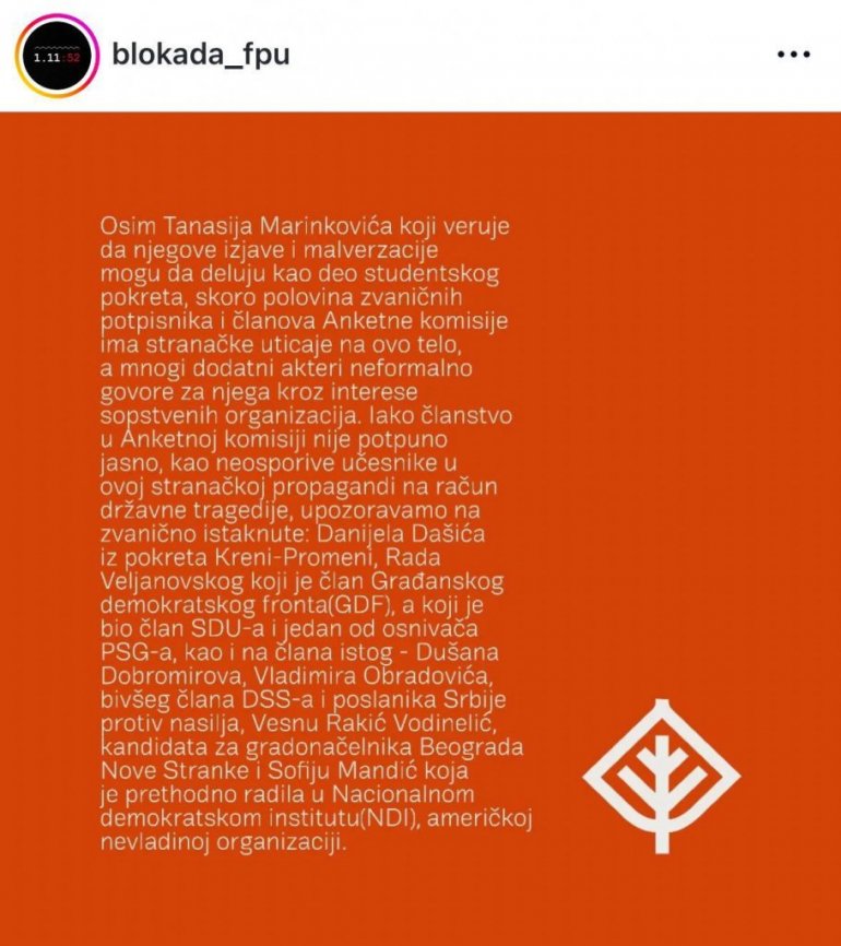 - Иако чланство у Анкетној комисији није потпуно јасно, као неоспориве учеснике у овој страначкој пропаганди на рачун државне трагедије, упозоравамо на званично истакнуте: Данијела Дашића из покрета Крени-Промени, Рада Вељановског који је члан Грађанског демократског фронта(ГДФ), а који је био члан СДУ-а и један од оснивача ПСГ-а, као и на члана истог - Душана Добромирова, Владимира Обрадовића, бившег члана ДСС-а и посланика Србије против насиља, Весну Ракић Водинелић, кандидата за градоначелника Београда Нове Странке и Софију Мандић која је претходно радила у Националном демократском институту(НДИ), америчкој невладиној организацији - навели су они.