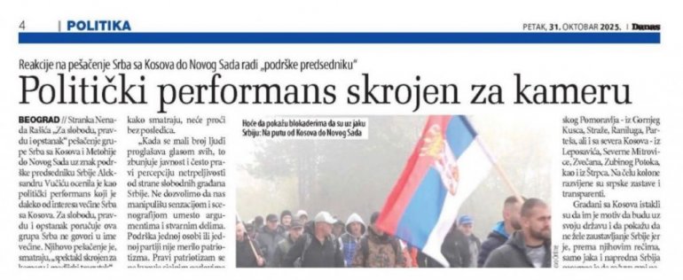 ШОЛАКОВ "Данас" пренео је саопштење странке Куртијевог Србина Ненада Рашића, у коме се марш Срба са Космета у знак подршке Србији, оцењује као "политички перформанс скројен за камеру".