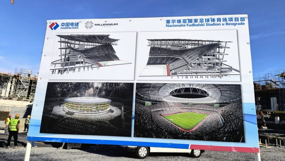 - Као што видите огромни су помаци. Ово лево је западна трибина, десна источна, иза вас северна трибина.. Просто много труда и рада је уложено. Много знања. Само шипова 2448, укупно ће бити 120 000 кубика бетона. Погледајте арматуре колико има.Никада нисам видео толико арматуре.људи раде 20 сати дневно у две смене, 2 пута по 10 сати. Укупно имамо 5000 радника овде на сајту ЕКСПА, на прузи која спаја аеродром са градом Београдом и са ЕКСПО и ОБреновцем и овде на националном стадијуму. Станови иду за нијансу брже од рока, ЕКСПО за нијансу рекао бих за неки дан спорије али надокнадићемо. Све је у року да се каже, једино каснимо са стадионом и то убразавамо и надамо се да ћемо завршити све до 28. фебруара 2027 године да биу нам објекат био припремљен за неке од догађаја, а што се фудбалских утакмица тиче од септембра 2027. Ту трава која се поставља, да ли ће бити хибридна или само вештачка, то треба фудбалски стручњаци да донесу одлуку. Што нам даје шансу да организујемо највеће утакмице на континенту и у свету. у међувремену морамо за Европско првенство младих да подигнемо нове стадионе. Видим на трибинама у Новом Саду и Суботици да транспаренти стоје "Нови Сад чека стадион", "Суботица чека стадион". Људи траже нове стандарде, воле фудбал, воле спорт,, тржае да уживају, да не кисну. Верујем да ће Србија имати снаге за то. Читав град се нови гради и верујем да ћемо бити добри домаћини најважније светске манифестације 2027 године.