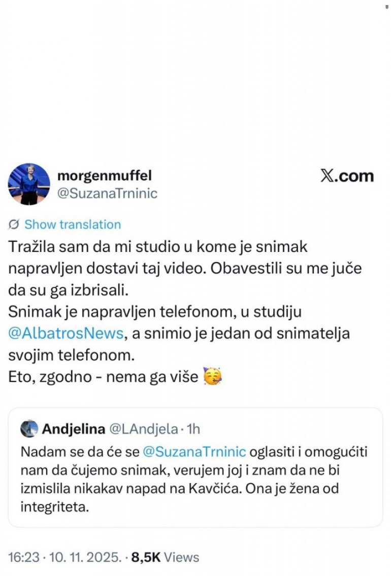 - Тражила сам да ми студио у коме је снимак направљен достави тај видео. Обавестили су ме да су га избрисали. Снимак је направљен телефоном, у студију Албатрос Њуз, а снимио га је један од сниматеља својим телефоном. Ето, згодно, нема га више - написала је Трнинић.