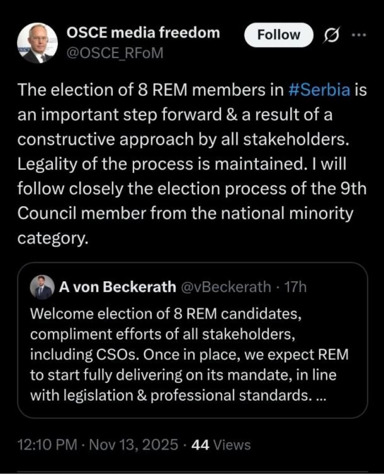 - Избор 8 чланова РЕМ-а у Србији је важан корак напред и резултат конструктивног приступа свих заинтересованих страна. Легалност процеса је очувана. Пажљиво ћу пратити процес избора 9. члана Савета из категорије националних мањина - рекао је представник ОЕБС-а Јан Брату, наводи се у објави на мрежи X.
