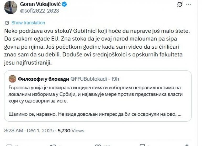 - Неко подржава ову стоку? Губитници који хоће да направе још мало штете. Да сваком огаде ЕУ. Зна стока да је овај народ малоуман па сипа говна по њима. Још почетком године када сам видео да су ћириличари знао сам да су дебили. Додуше ови средњошколци с опскурних факултета јесу најфрустиранији - написао је он на друштвеној мрежи Икс.