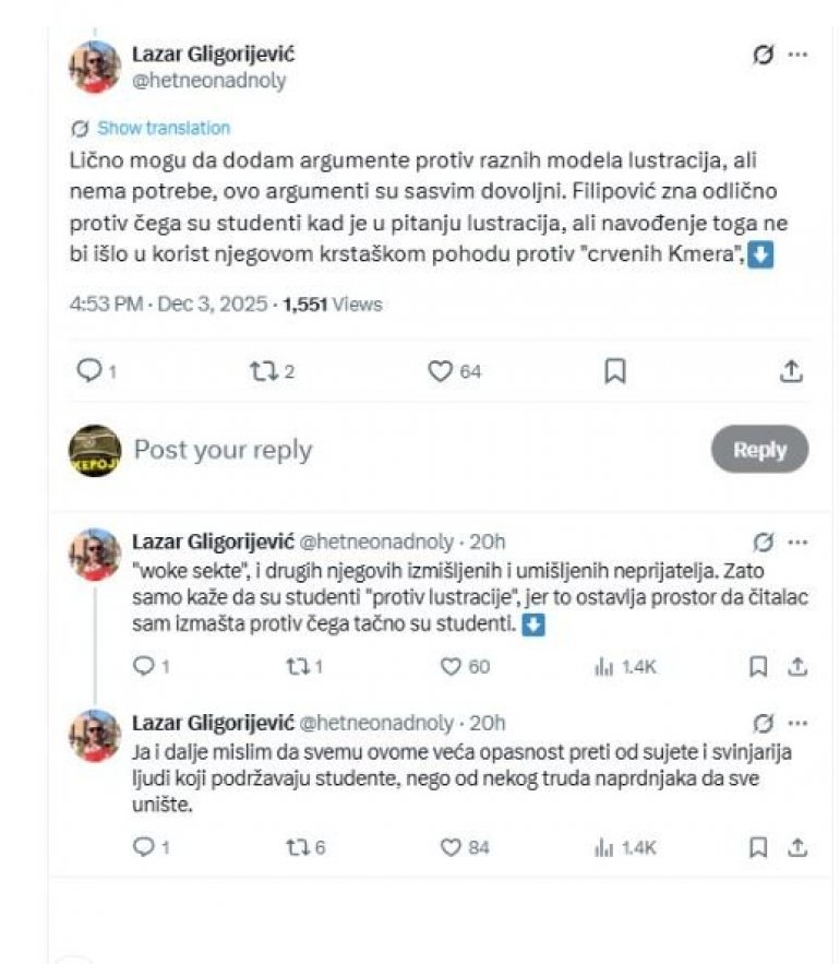 - Филиповић зна одлично против чега су студенти кад је у питању лустрација, али навођење тога не би ишло у корист његовом крсташком походу против "црвених Кмера". Зато само каже да су студенти "против лустрације", јер то оставља простор да читалац сам измашта против чега тачно су студенти. Ја и даље мислим да свему овоме већа опасност прети од сујете и свињарија људи који подржавају студенте, него од неког труда напредњака да све униште - објавио је Глигоријевић на мрежи X.