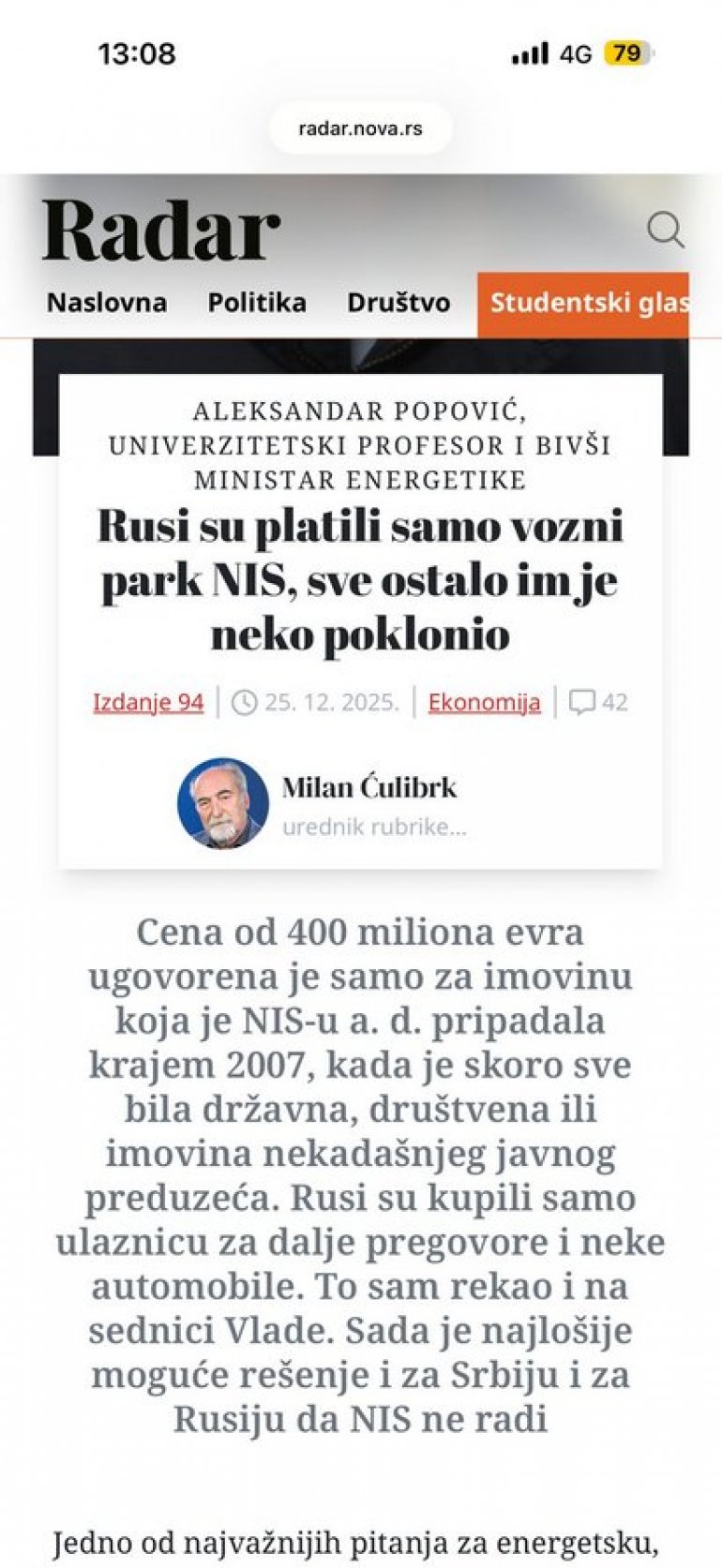 НЕДЕЉНИК "Радар" објавио је вест да су "Руси платили само возни парк НИС, све остало им је неко поклонио", те да је уговорена цена од 400 милиона евра само за имовину која је НИС-у припадала крајем 2007. године.