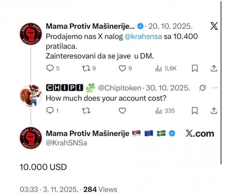 НА профилу на друштвеној мрежи X названом "Мама против машинерије" објављено је да се ставља на продају.
