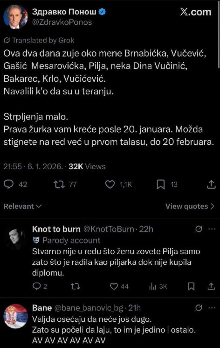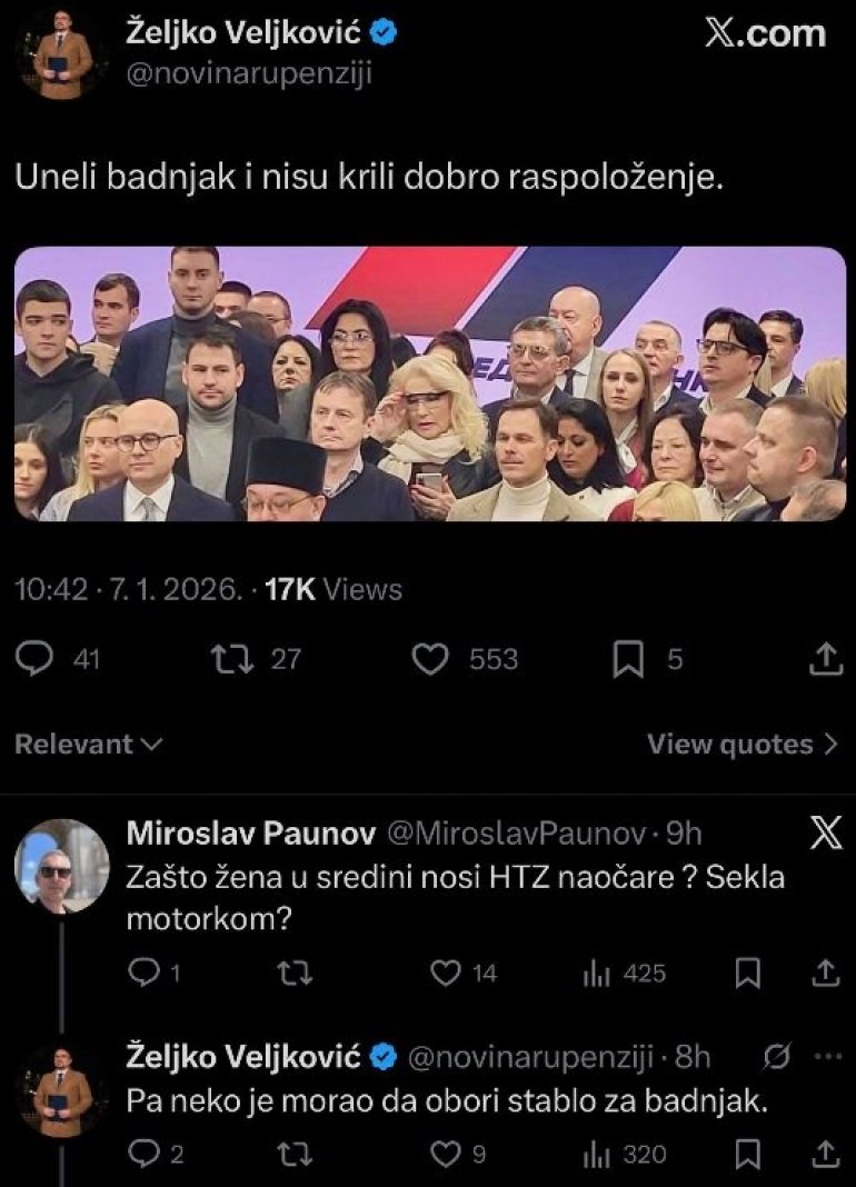 - И сам Вучић се оглашавао само да честита нашем народу празник и да укаже на оне ствари које су се дешавале широм света као и на опасности које се спремају и Србији током 2026. године. Ми се чак ни на то из странке нисмо оглашавали, али је добро да људи виде разлику и добро је да виде како је сада више него пре искоришћено време од стране блокадера да за празнике нападају председника - рекла је Брнабић.