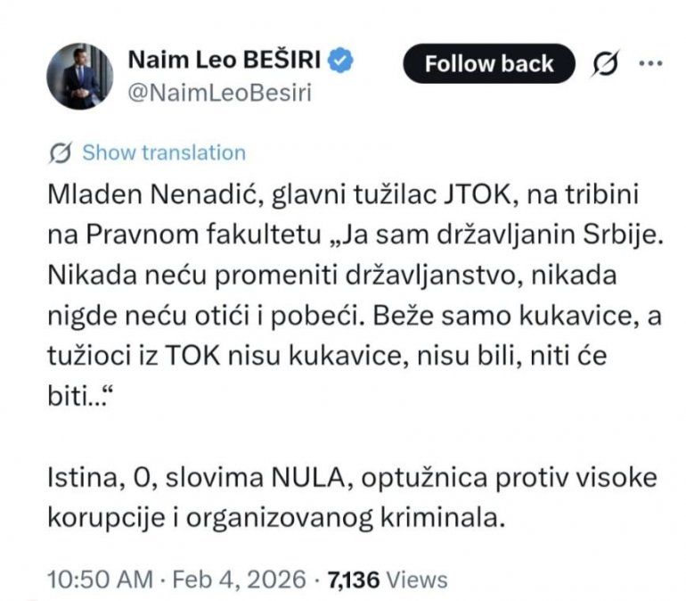 - Младен Ненадић, главни тужилац ЈТОК, на трибини на Правном факултету "Ја сам држављанин Србије. НИкада нећу променити држављанство, никада нигде нећу отићи и побећи. Беже само кукавице, а тужиоци из ТОК нису кукавице, ниси били, нити ће бити... Истина, 0, словима НУЛА, оптужница против високе корупције и организованог кримилана - навео је Наим Лео Бешири на мрежи X.