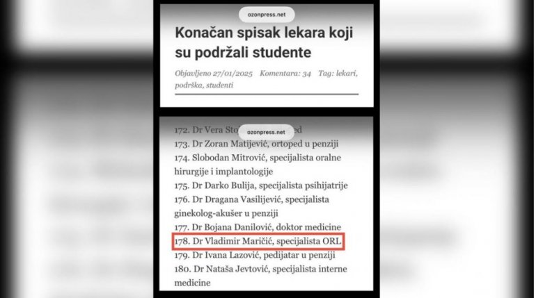 Др Владимир Маричић, специјалиста ОРЛ, је био на коначном списку лекара који су подржали студенте.