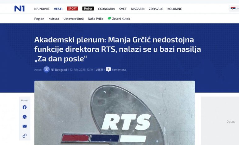 Академски пленум изразио је бојазан да је Мања Грчић на позицију директора јавног сервиса постављена како би по налогу власти успоставила потпуну цензуру и завршила чистку у РТС-у, коју је започео претходни директор јавног сервиса.