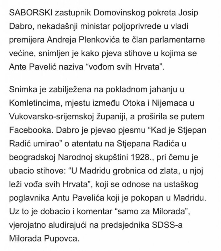 Јосип Дабро, саборски заступник Домовинског покрета и бивши министар пољопривреде, снимљен је како пева стихове који величају усташког вођу Анту Павелића.