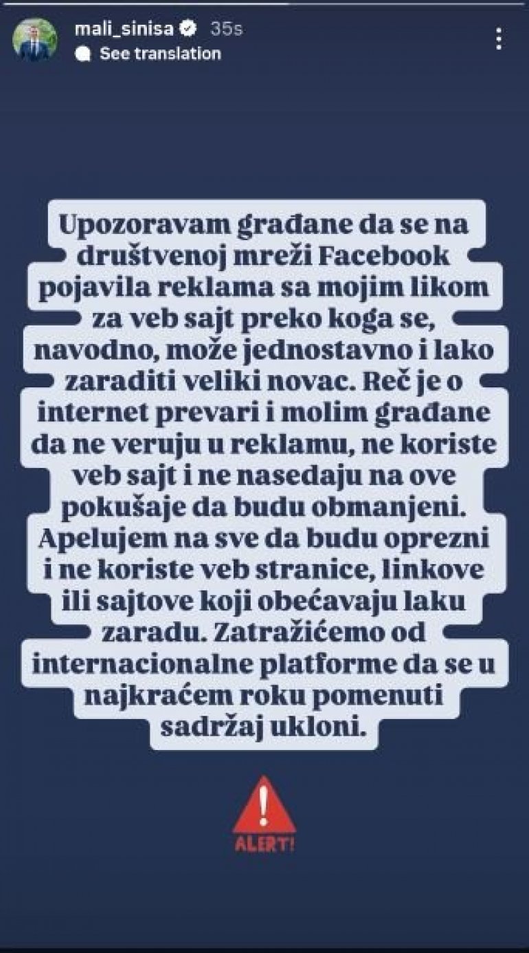 - Реч је о интернет превари и молим грађане да не верују у рекламу, не користе веб сајт и не наседају на ове покушаје да буду обмањени. Апелујем на све да буду опрезни и не користе веб странице, линкове или сајтове који обећавају лаку зараду. Затражићемо од интернационалне платформе да се у најкраћем року поменути садржај уклони - наводи се у објави министра Малог на Инстаграму.