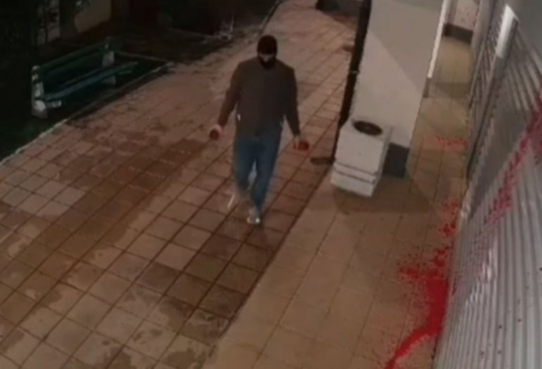 На снимку који је објављујемо виде се двојица маскираних хулигана како просипају црвену течност на просторије напредњака.