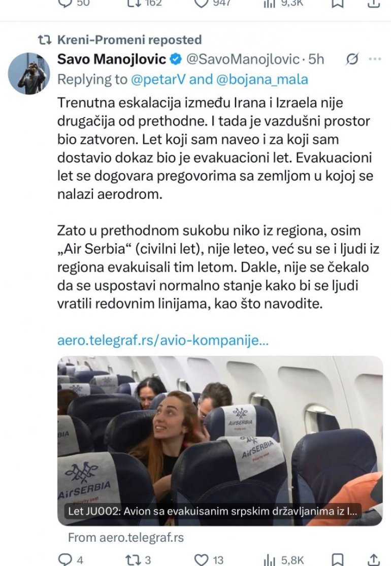 - Тренутна ескалација између Ирана и Израела није другачија од претходне. И тада је ваздушни простор био затворен. Лет који сам навео и за који сам доставио доказ био је евакуациони лет. Евакуациони лет се договара преговорима са земљом у којој се налази аеродром.