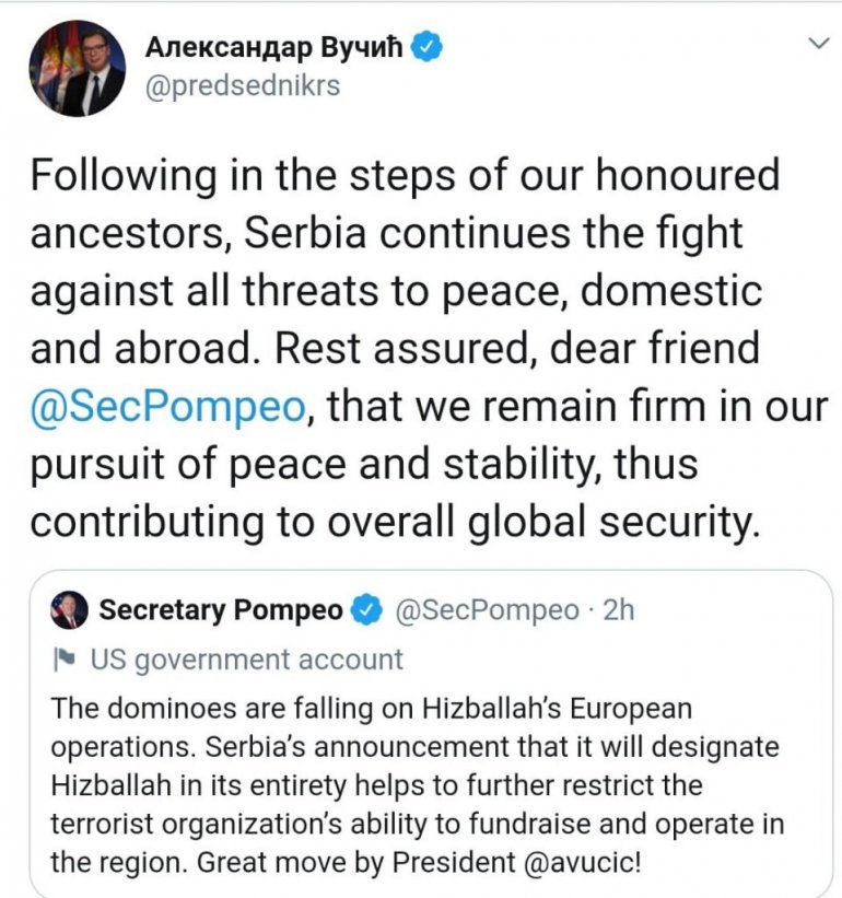 ПРЕДСЕДНИК Србије Александар Вучић на свом Твитер налогу написао је, обраћајући се Мајку Помпеу, да Србија наставља борбу против свих претњи миру, како унутар, тако и ван наше земље.