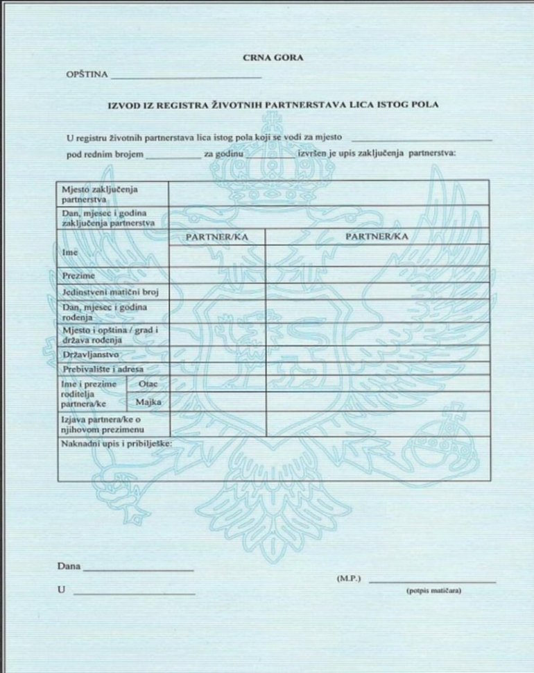 IZVOD Iz registra životnih partnerstava osoba istog pola , Foto Službeni list CG