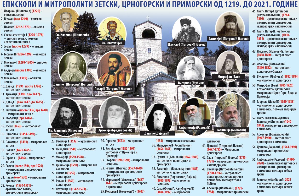 On podseća da je od osnivanja Zetske episkopije 1219. godine pa do 1484, kada je gospodar Zete Ivan Crnojević podigao Manastir rođenja Presvete Bogorodice na Cetinju, njenom sedištu, na katedri zetskih episkopa i mitropolita, prema poznatim podacima, bilo 15 arhijereja. Za većinu se ne može utvrditi precizno vreme od kada do kada su bili episkopi ili mitropoliti. Njihov hronološki redosled sačinjen je na osnovu godina u kojima se u izvorima pominju. Do 1346. imenovani su bili episkopi, a od tada mitropoliti jer je Srpska arhiepiskopija uzdignuta na nivo patrijaršije, a sledstveno tome, jedan broj episkopija je uzdignut u rang mitropolija, i od tada se mogu titulisati kao mitropoliti.