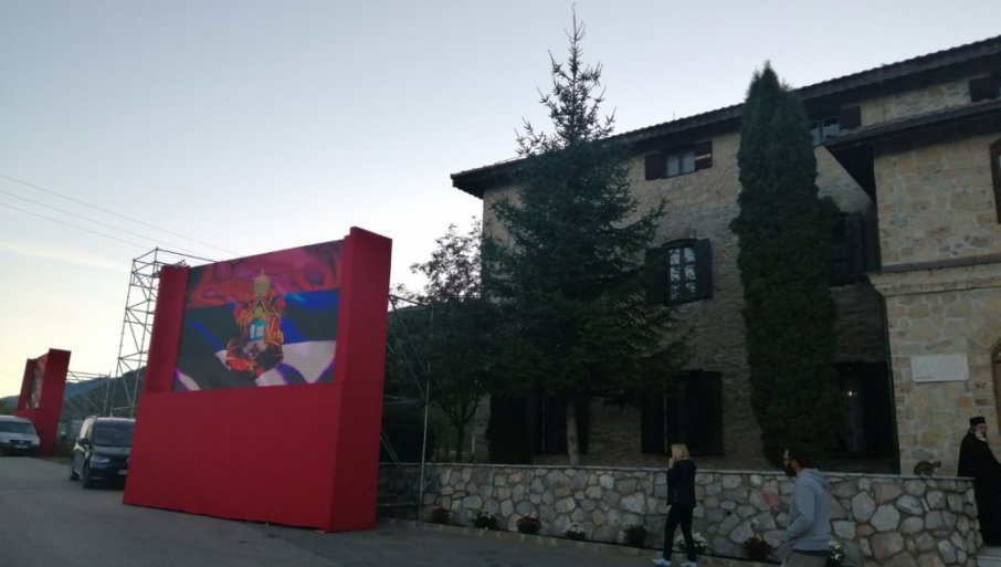U porti manastira postavljena je velika bina, sa više video-bimova, na kojoj će se odviti centralna manifestacija. Na video - bimovima, kao i na ulasku u portu manastira, vijore se trobojke.