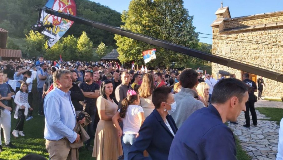 Kako javljaju reporteri "Novosti" ispred manastira se večeras okupilo 10.000 vernika, narod je od 16 časova pristizao sa trobojkama uz povike "Kosovo je srce Srbije". Oko manastira su bile raspoređene bezbednosne snage.