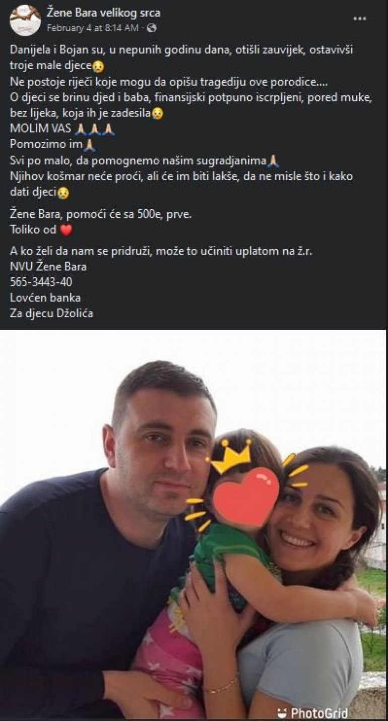 - Danijela i Bojan su, u nepunih godinu dana, otišli zauvek, ostavivši troje male dece. Ne postoje reči koje mogu da opišu tragediju ove porodice.... O deci se brinu deda i baba, finansijski potpuno iscrpljeni, pored muke, bez leka, koja ih je zadesila. Molim vas, pomozimo im. Svi po malo da pomognemo našim sugrađanima. Njihov komšmar neće proći, ali će im biti lakče, da ne misle šta i kako dati deci - napisale su one unutar objave, dodavši kako će one prve uplatiti 500 evra za pomoć.