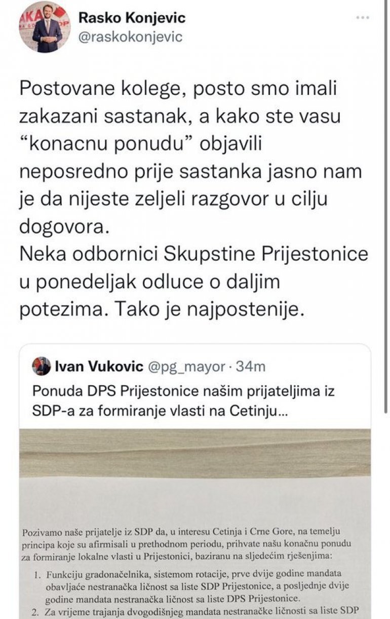 - Uprkos zakazanom sastanku, vi ste "konačnu ponudu" objavili neposredno pre, pa je jasno da niste želeli razgovor u cilju dogovora. Neka odbornici Skupštine Prestonice u ponedeljak odluče o daljim potezima. Tako je najpoštenije - odgovorio je, na istom mestu, lider SDP Raško Konjević, dok je njihov nosilac liste na Cetinju Nikola Đurašković decidirano poručio da su razgovori sa DPS završeni!