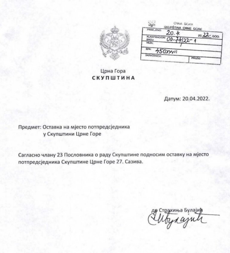 Njegova ostavka objavljena je na sajtu Skupštine Crne Gore.