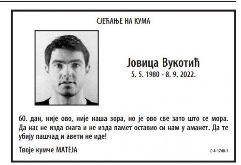 - Sjećanje na kuma. 60. dan, nije ovo, nije naša zora, no je ovo sve zato što se mora. Da nas ne izda snaga i ne izda pamet ostavio si nam u amanet. Da te ubiju paščad i avetinje ne ide! Tvoje kumče Mateja - navodi se u čitulji.