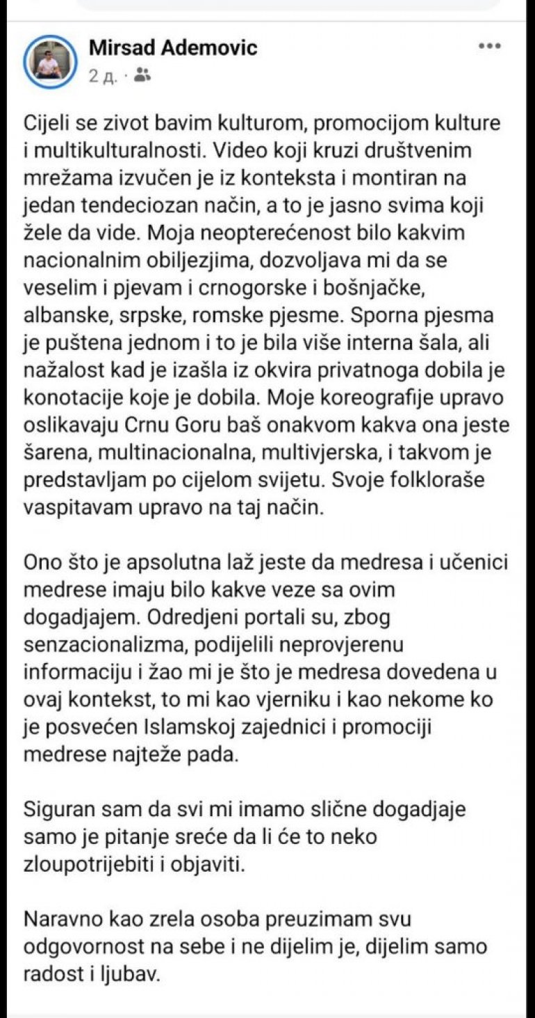 SNIMAK na kome se vidi da profesor Gimnazije "25.maj" i Medrese "Mehmed Fatih", Mirsad Ademović, peva u jednom od lokala u Tuzima "Veseli se srpski rode" izazvao je lavinu reakcija u Crnoj Gori.