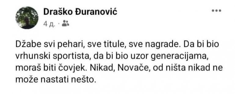 – Džabe svi pehari, sve titule, sve nagrade. Da bi bio vrhunski sportista, da bi bio uzor generacijama, moraš biti čovek. Nikad, Novače, od ništa nikad ne može nastati nešto – napisao je Đuranović na Fejsbuku.