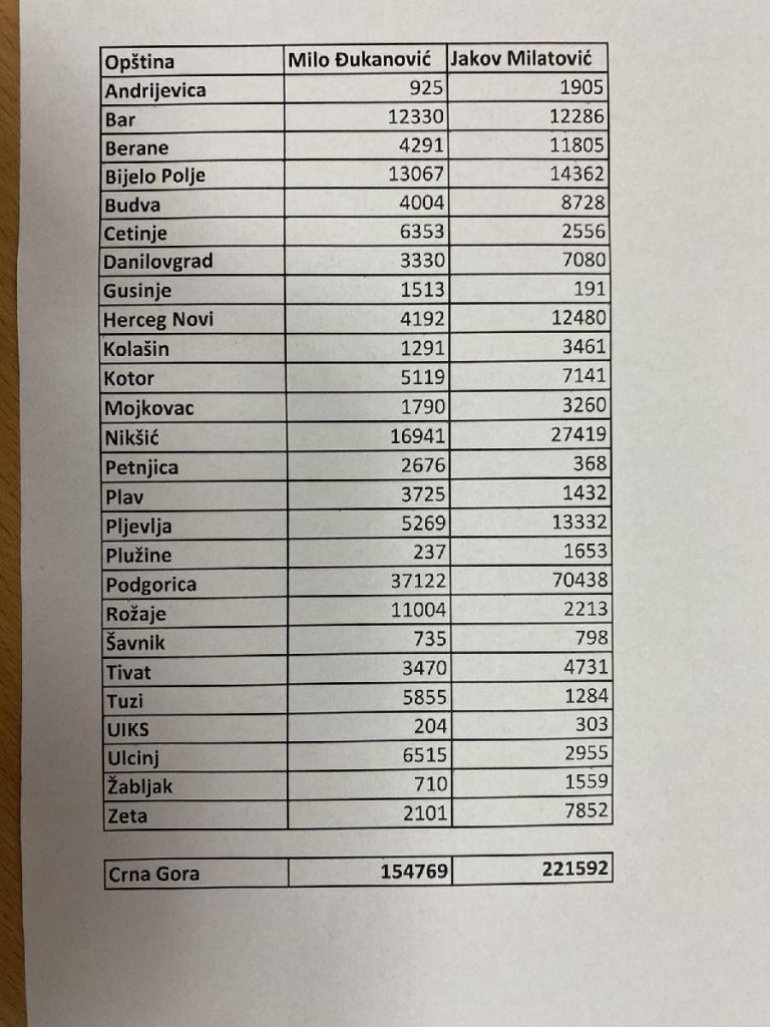 NOVOIZABRANI predsednik Crne Gore Jakov Milatović dobio je 221.592 glasa na jučerašnjim predsedničkim izborima, a kandidat DPS-a Milo Đukanović 154.769. To su preliminarni rezultati, koje je Državna izborna komisija (DIK) dobila od opštinskih izbornih komisija.