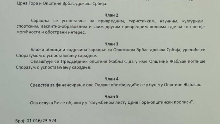 Odbornici Skupštine opštine Žabljak jednoglasno su izglasali Odluku o uspostavljanju saradnje između gradova Žabljak-Crna Gora i Vrbas-Srbija.