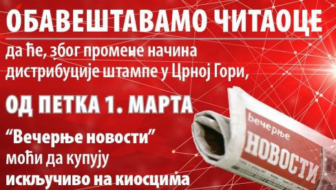 Obaveštavamo čitaoce da će, zbog promene načina distribucije štampe u Crnoj Gori, od petka, 1. marta "Večernje novosti" moći da kupuju isključivo na kioscima.