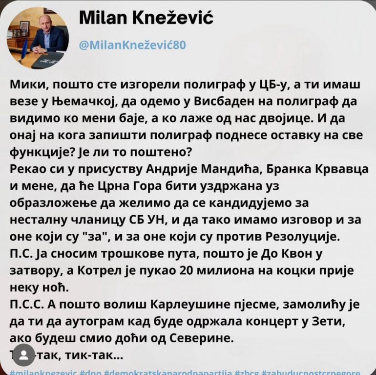 MILAN Knežević je putem društvenih mreža pozvao premijera CG Milojka Spajića da zajedno odu na poligraf, i to u Nemačku, da bi se utvrdilo ko laže, aludirajući na skorašnja dešavanja i izdaju od strane Crne Gore po pitanju rezolucije o Srebrenici.
