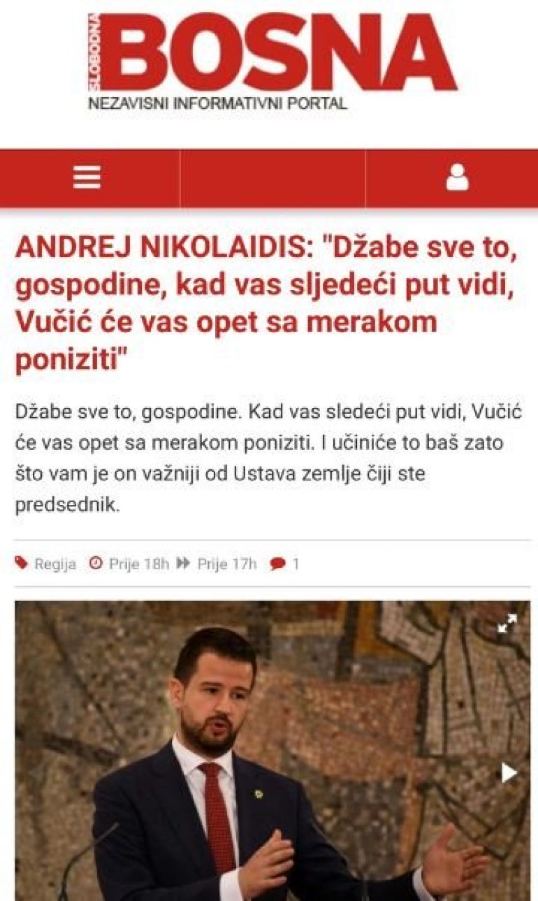 "Džabe sve to, gospodine. Kad vas sledeći put vidi, Vučić će vas opet sa merakom poniziti", poručuje Nikolaidis Milatoviću u autorskom tekstu na portalu "Slobodna Bosna".