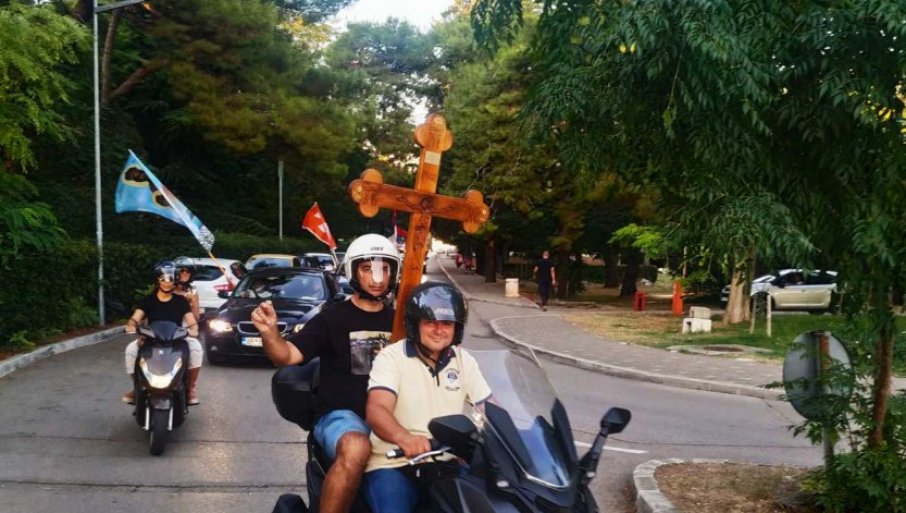 Dok su pristalice SPC okupljanje završavali pesmom “Tamo daleko”, ispred sportske sale “Topolica” je krenula organizovana kolona pro crnogorske opcije čiji moto je “Crnoj Gori s ljubavlju”.