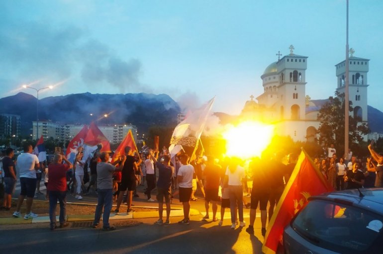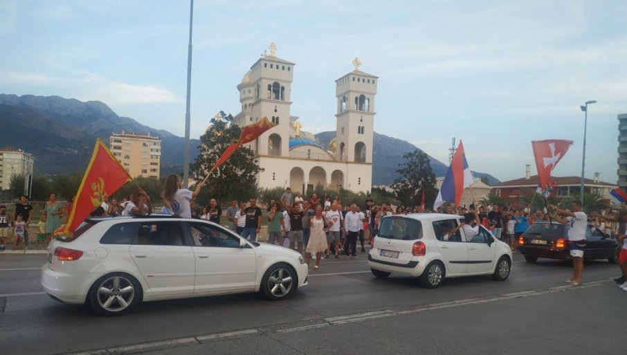 Za razliku od auto litija koje su održane tokom avgusta na kojima su bila istaknuta samo crkvena zastava i trobojke sa crnogorskim obeležjima, večeras su učesnici litije istakli i zastave Srbije.