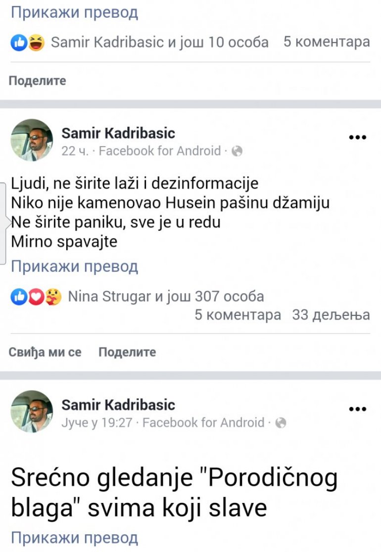 -Ljudi, ne širite laži i dezinformacije. Niko nije kamenovao Husein-pašinu džamiju. Ne širite paniku, sve je u redu. Mirno spavajte - naveo je Kadribašić.