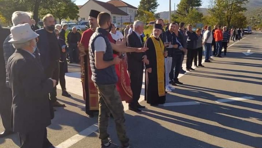 Nadomak Podgorice okupljeni vernici dočekuju mitropolita Amfilohija iz Cetinja.