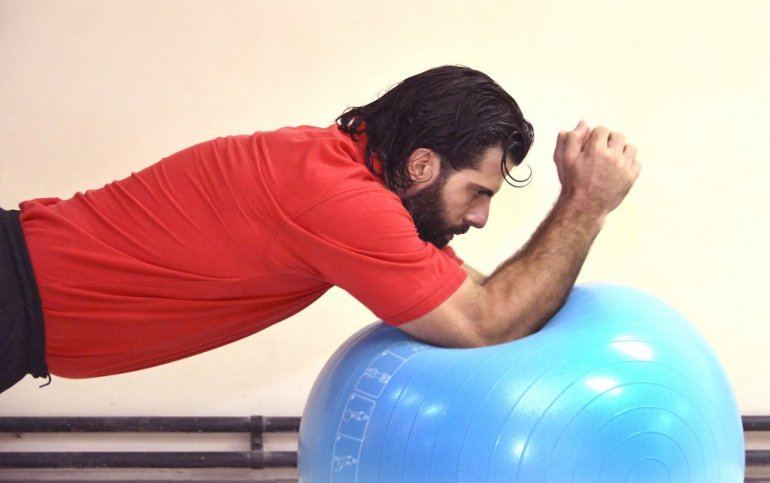 Položaj tela je ravan, stomak ga konstantno drži u jednoj ravni, ne dozvoljava da karlica propadne dole. Iz tog neutralnog položaja laktovima guramo pilates loptu od sebe i privlačimo je, laktovi su prenosioci onoga što radi stomak.